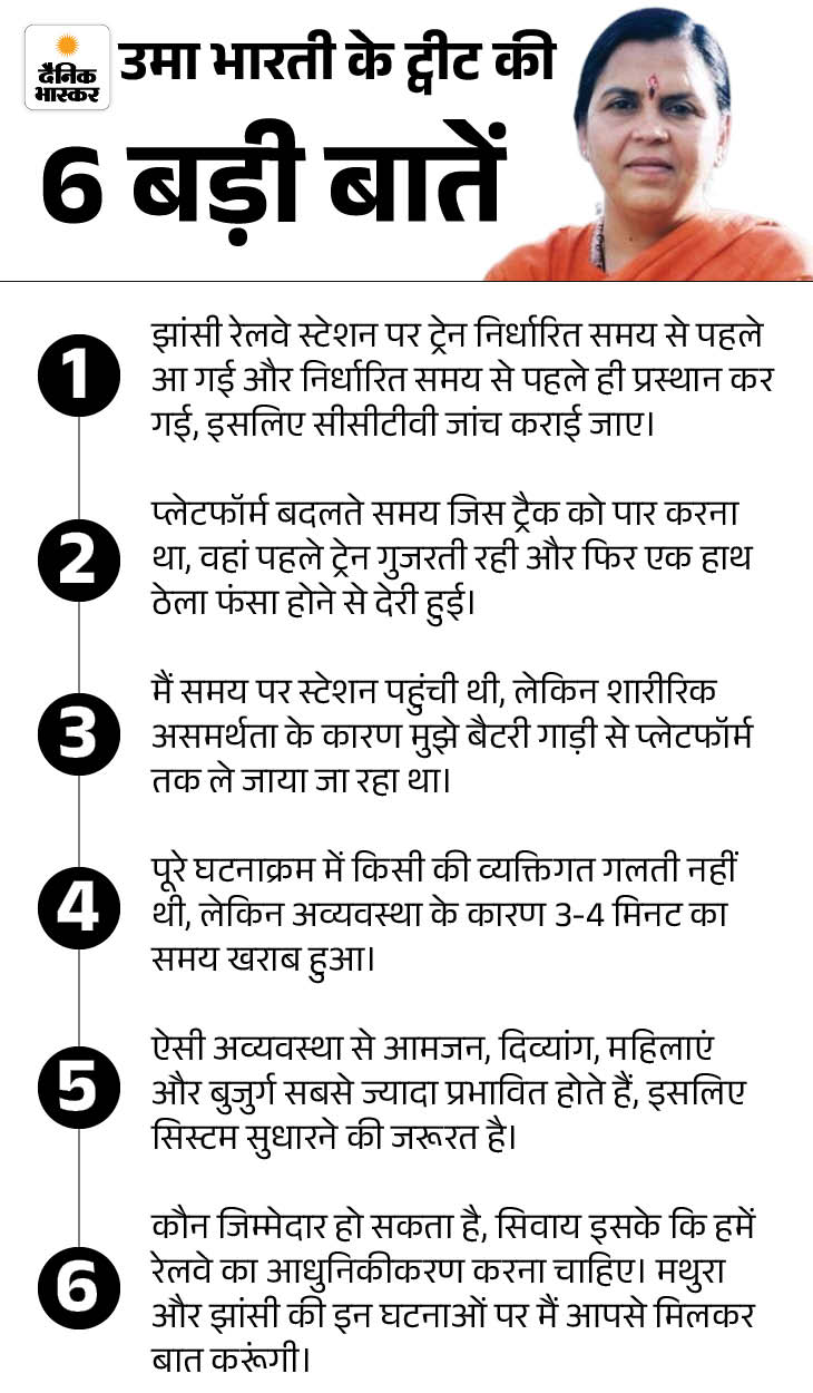 सीसीटीवी निकलवाए जाएं उमा भारती ने लिखा- झांसी रेलवे स्टेशन के सीसीटीवी निकलवाए जाएं। मैं झांसी रेलवे स्टेशन पर ट्रेन आने के पहले आ गई थी और यह ट्रेन निर्धारित समय से पूर्व टाइम पर आ गई और निर्धारित समय से पूर्व प्रस्थान हो गई। मुझे बैटरी गाड़ी में बैठाकर प्लेटफॉर्म नंबर 1 से 4 नंबर की तरफ ले जाया जा रहा था। इतने में उसी ट्रैक से एक गाड़ी लंबे समय तक गुजरी और हम खड़े रहे।