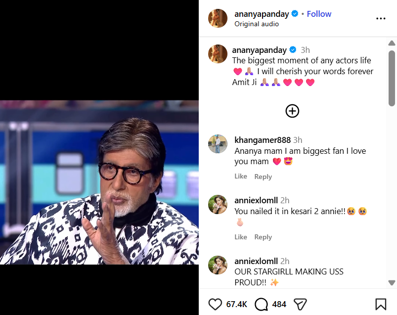 अनन्या ने इस क्लिप को अपने इंस्टाग्राम अकाउंट पर शेयर करते हुए लिखा- ‘किसी भी एक्टर के जीवन का सबसे बड़ा पल। अमित जी, मैं आपके शब्दों को हमेशा संजो कर रखूंगी।’