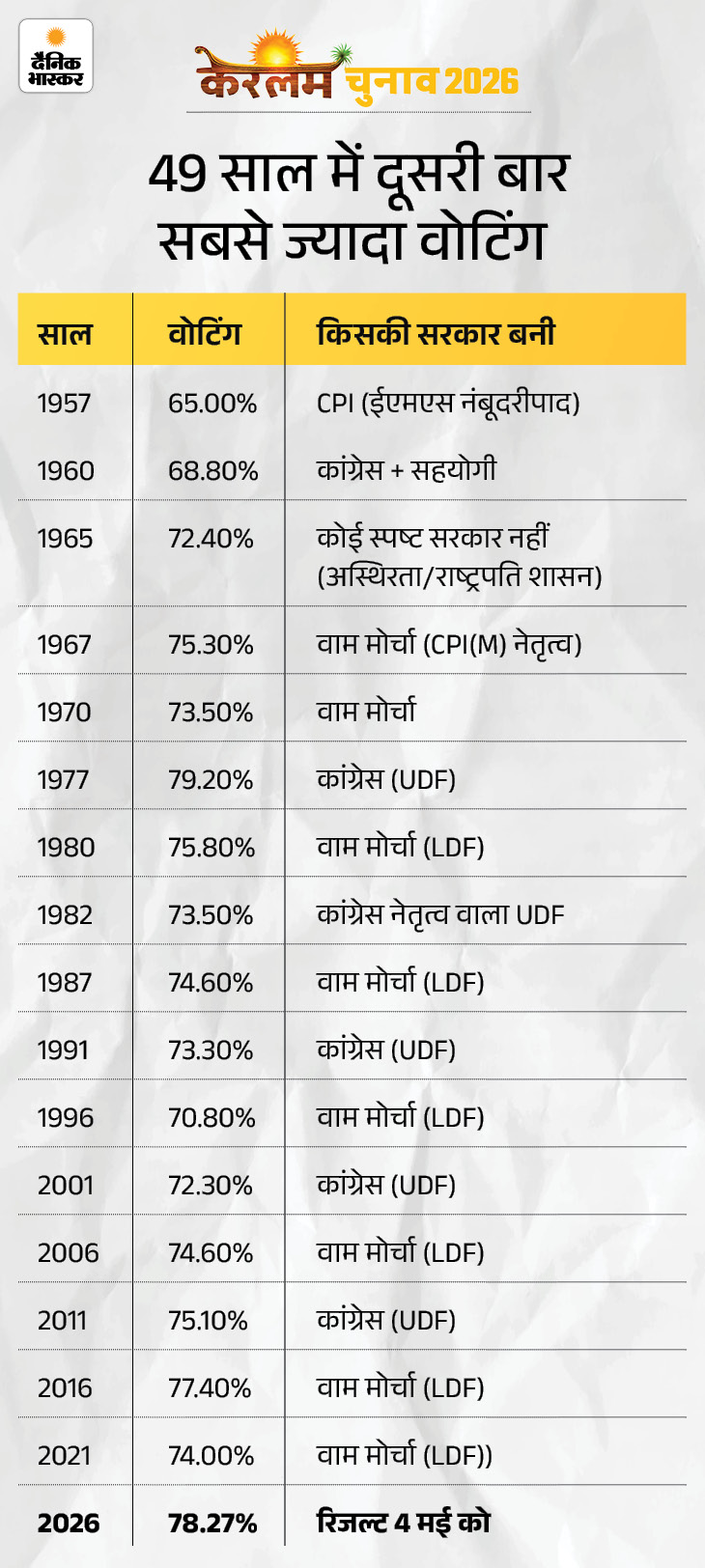1956 में केरलम के गठन के बाद से अब तक राज्य में 12 मुख्यमंत्री बन चुके हैं। इनमें से 6 सीएम लेफ्ट के रहे, जिन्होंने 39 साल सत्ता संभाली। वहीं 4 सीएम कांग्रेस के बने, जिन्होंने 28 साल सरकार चलाई।