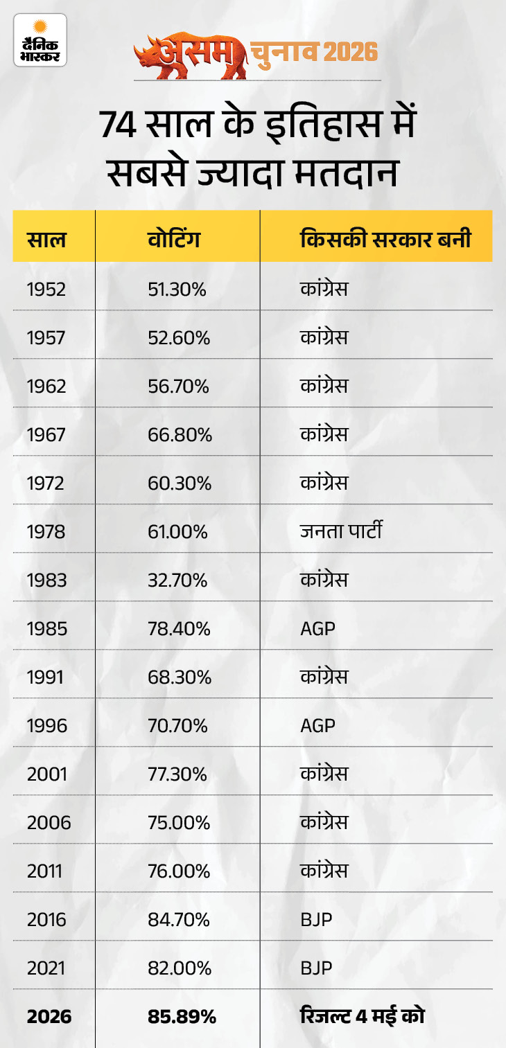 देश के दो राज्यों असम, केरलम और केंद्र शासित प्रदेश पुडुचेरी में गुरुवार को विधानसभा चुनाव के लिए वोट डाले गए। 1950 में असम के बनने के बाद से राज्य में सबसे ज्यादा 85.89% वोटिंग हुई। इससे पहले 2016 में 84.7% मतदान हुआ था।