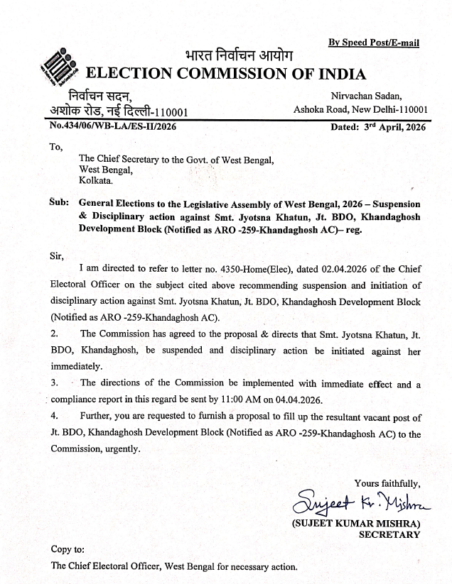 चुनाव आयोग ने पश्चिम बंगाल के खंडघोष की जॉइंट BDO ज्योत्सना खातून को सस्पेंड कर दिया है और उनके खिलाफ अनुशासनात्मक कार्रवाई शुरू की है।