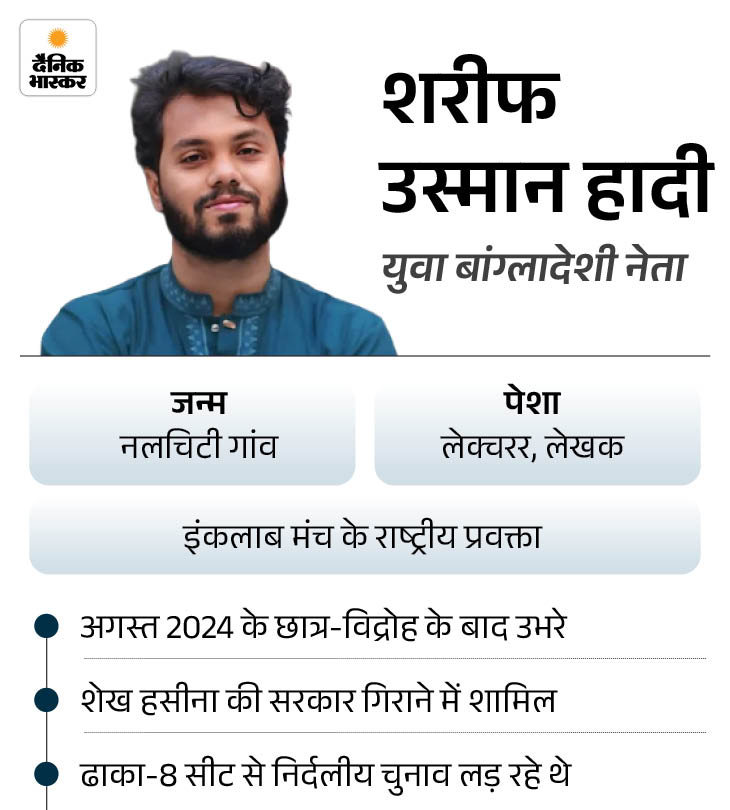 हादी इस्लामी संगठन ‘इंकलाब मंच’ के प्रवक्ता थे और चुनाव में ढाका से निर्दलीय उम्मीदवार थे। इंकलाब मंच अगस्त 2024 के छात्र आंदोलन के बाद एक संगठन के रूप में उभरा। इसने तत्कालीन प्रधानमंत्री शेख हसीना की अवामी लीग की सरकार को गिरा दिया था।