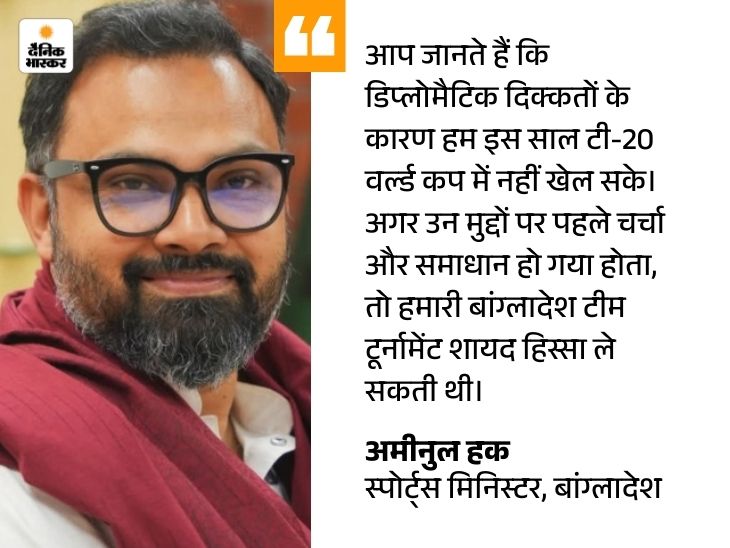 बांग्लादेश के नए स्पोर्ट्स मिनिस्टर अमीनुल हक BCCI और भारत के साथ रिश्ते सुधारना चाहते हैं। उन्होंने कहा कि वह इस मुद्दे को जल्दी सुलझाना चाहते हैं। उन्होंने बांग्लादेश के मौजूदा टी-20 वर्ल्ड कप में हिस्सा न लेने का जिक्र किया।
