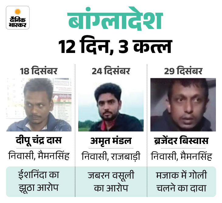 बांग्लादेश में 12 दिन के भीतर 3 हिंदुओं की हत्या की जा चुकी है। 18 दिसंबर को दीपू चंद्र की हत्या के बाद 24 दिसंबर को भीड़ ने एक हिंदू युवक की पीट-पीटकर हत्या कर दी गई थी। घटना राजबाड़ी जिले के होसेनडांगा गांव में हुई। पुलिस के मुताबिक मृतक की पहचान 29 वर्षीय अमृत मंडल उर्फ सम्राट के तौर पर हुई।