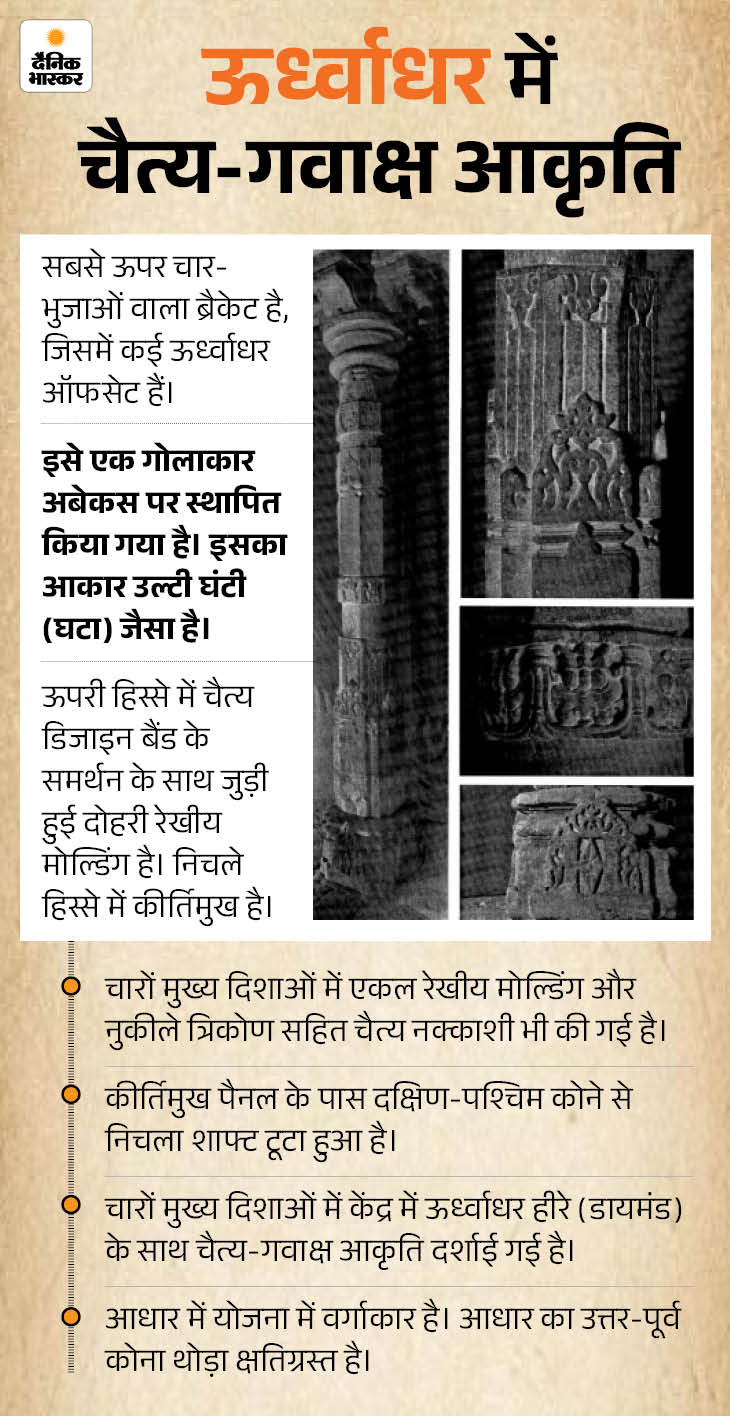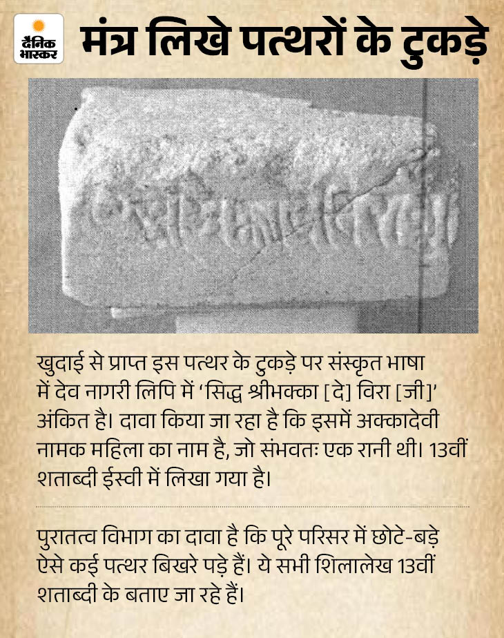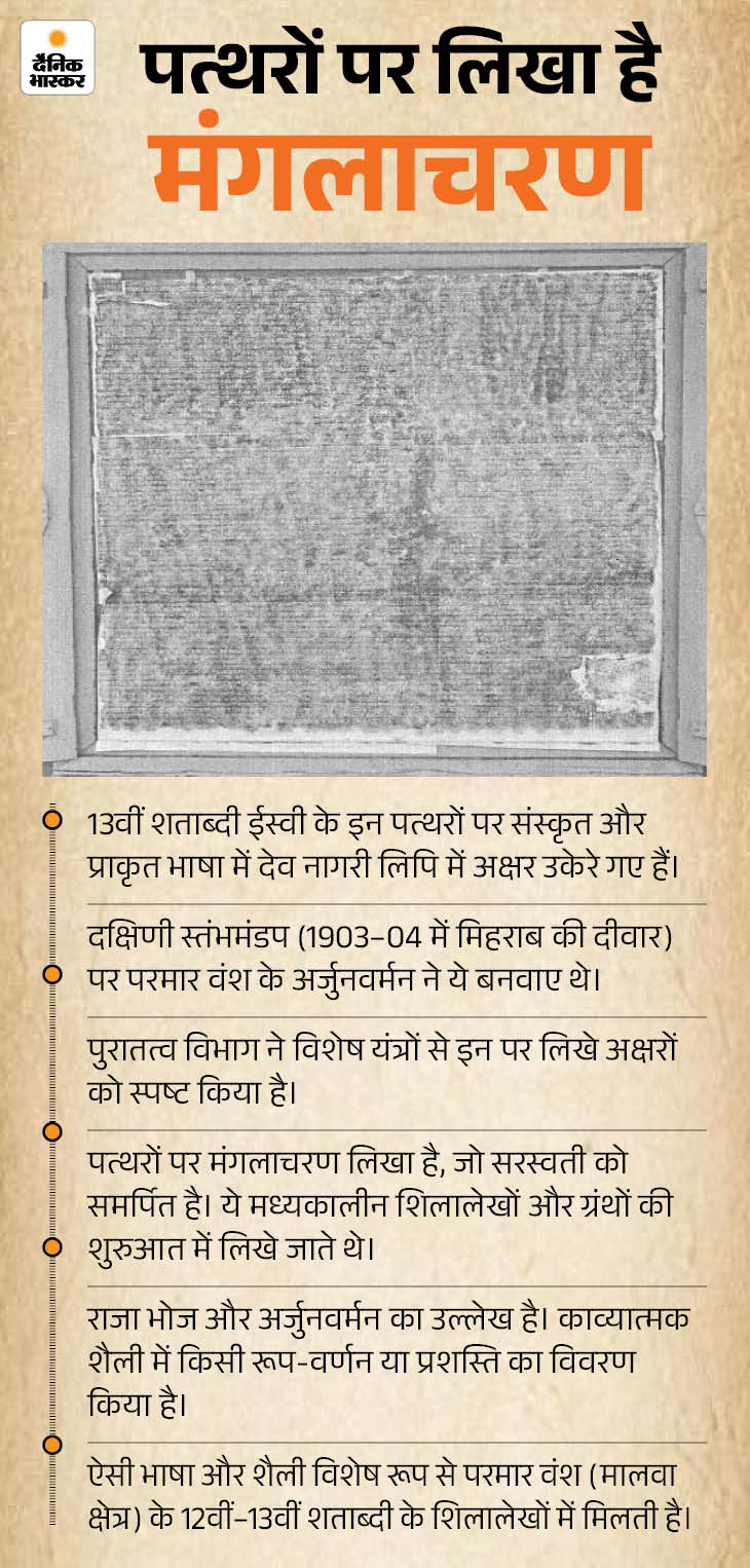 रिपोर्ट के अनुसार, पूरे परिसर में कुल 106 स्तंभ मिले हैं, जिन पर अलग-अलग प्रकार की नक्काशी और डिजाइन हैं। इसके अलावा 32 शिलालेख भी हैं। इन शिलालेखों में राजा भोज के समय लिखित और अर्जुन वर्मन के राजगुरु मदन द्वारा रचित ‘पारिजलमंजरी नाटिका’ और ‘विजयश्री’ नाटक के पहले दो अंकों का उल्लेख है। अलग-अलग पत्थरों पर ऐसी कई रचनाएं और नाट्यांश लिखे हैं।
