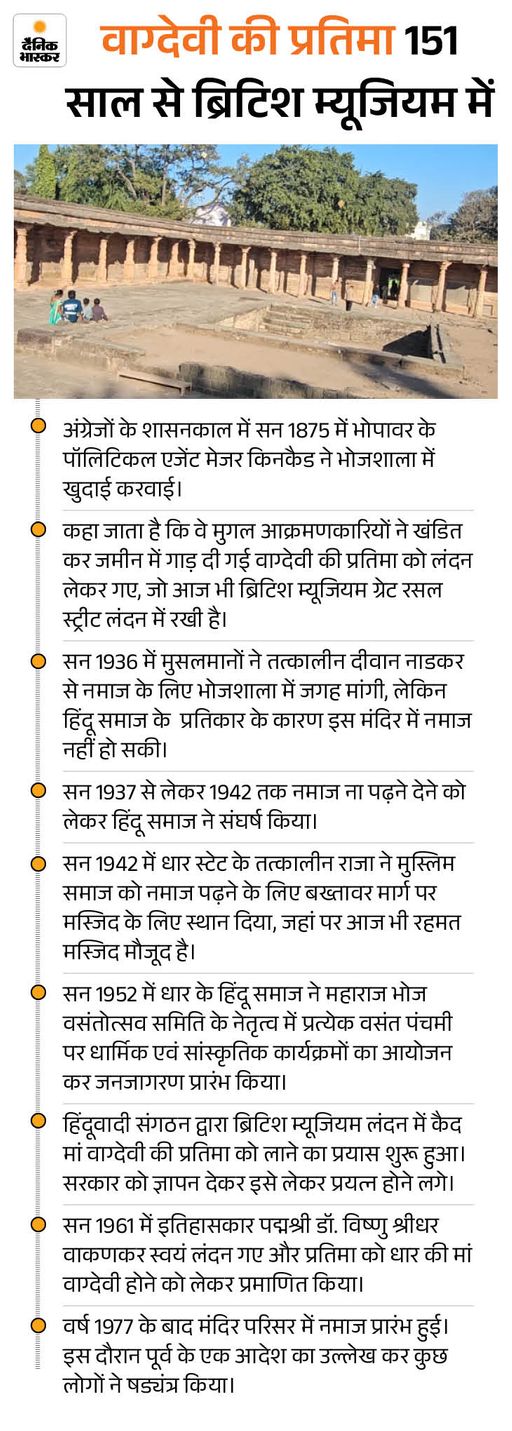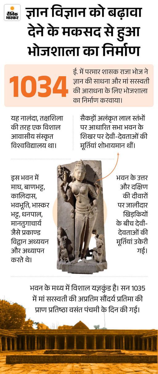भोजशाला का इतिहास करीब 990 साल पुराना है। 1034 ई. में राजा भोज ने इसका निर्माण कराया था और यहां मां वाग्देवी की प्रतिमा स्थापित की थी। 200 सालों से ज्यादा समय तक भोजशाला का वैभव कायम रहा, लेकिन 1305 ई में मोहम्मद खिलजी ने भोजशाला पर आक्रमण कर इसे नेस्तनाबूत करने की कोशिश की। पढ़ें पूरी खबर…