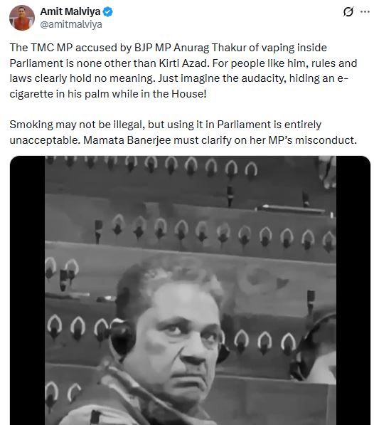 मालवीय ने दावा किया कि भाजपा सांसद अनुराग ठाकुर ने संसद में ई सिगरेट पीने का आरोप लगाया था। वह टीएमसी सांसद कीर्ति आजाद के अलावा और कोई नहीं हैं।