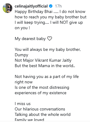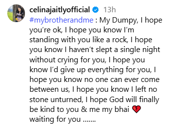 वहीं इससे पहले भी नवंबर में सेलिना जेटली ने भाई को लेकर सोशल मीडिया पर भावुक पोस्ट शेयर की थी और बताया था कि भाई की याद में वह एक भी रात बिना रोए नहीं सो पातीं। सेलिना ने लिखा था कि वह अपने भाई के साथ चट्टान की तरह खड़ी हैं और उनके लिए हर संभव प्रयास कर चुकी हैं।