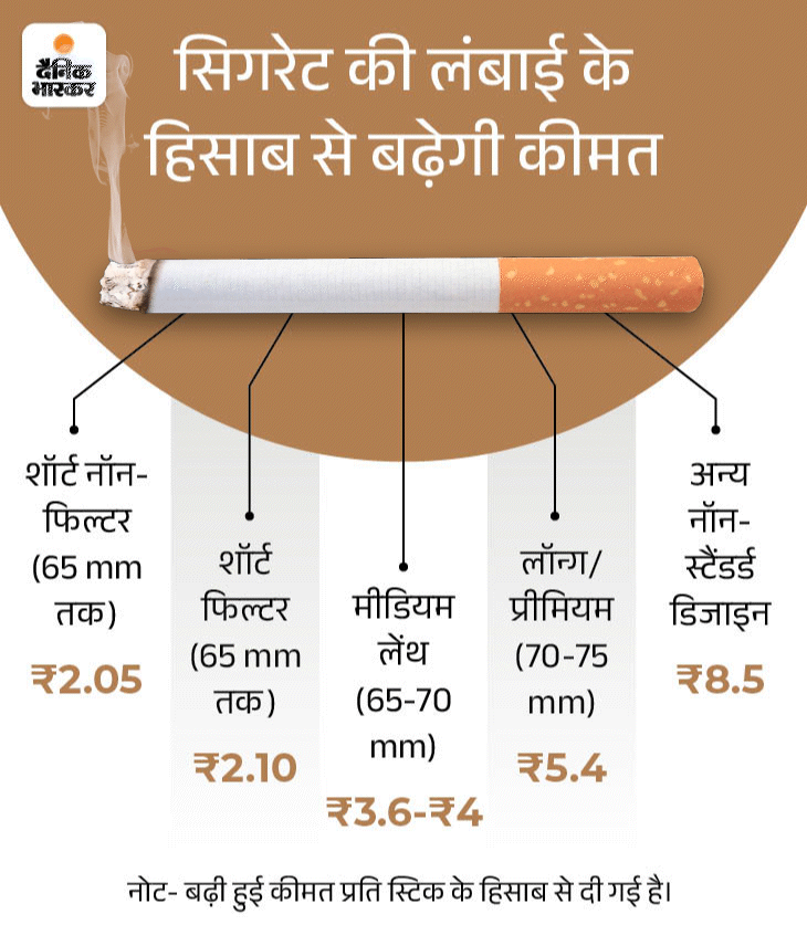 - सिगरेट पर उसकी लंबाई के आधार पर नई एक्साइज ड्यूटी भी लागू होगी। ₹2.05 से लेकर ₹8.5 प्रति स्टिक तक ये एक्साइज ड्यूटी लगेगी। इसके अलावा तंबाकू उत्पादों की तरह सिगरेट पर 40% GST भी लगेगा। हालांकि बीड़ी पर राहत देते हुए जीएसटी को 18% कर दिया गया है।