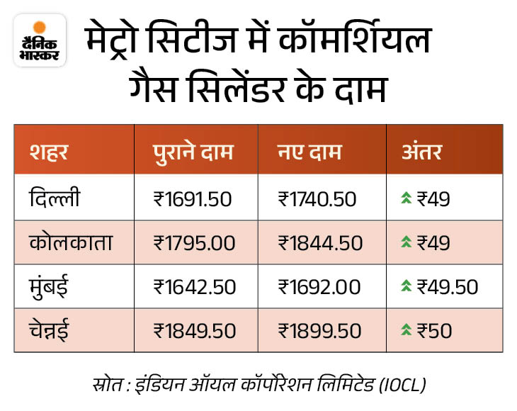 आज से 19 किलो वाला कॉमर्शियल गैस सिलेंडर 50 रुपए तक महंगा हो गया है। दिल्ली में इसकी कीमत 49 रुपए बढ़कर ₹1740.50 हो गई है। पहले यह ₹1691.50 में मिल रहा था। वहीं चेन्नई में यह अब 50 रुपए महंगा होकर 1899.50 रुपए में मिलेगा।