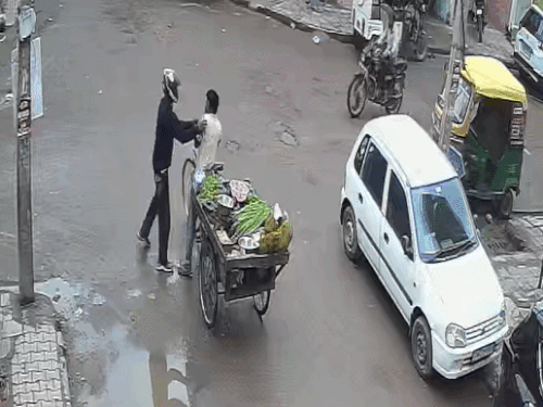 लूट की पूरी वारदात CCTV कैमरे में कैद हो गई। पुलिस ने शिकायत लेकर जांच शुरू कर दी है। हालांकि अभी तक आरोपी के बारे में पता नहीं चल सका है। सीसीटीवी फुटेज में दिख रहा है कि सब्जी विक्रेता रूटीन की तरह अपनी रेहड़ी लेकर गुजर रहा है। तभी बाईं तरफ से लुटेरा काले कपड़े पहनकर चेहरे पर हेलमेट लगाए हुए आता है।