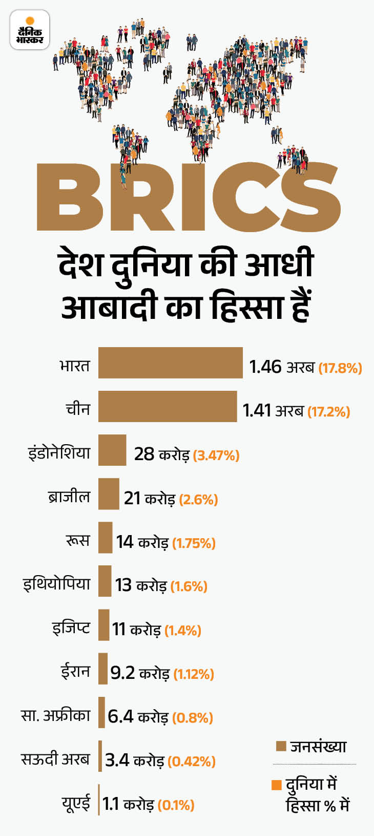 BRICS 11 प्रमुख उभरती हुई अर्थव्यवस्थाओं वाले देशों का एक समूह है। इनमें ब्राजील, रूस, भारत, चीन, दक्षिण अफ्रीका, मिस्र, इथियोपिया, ईरान, संयुक्त अरब अमीरात (UAE), सऊदी अरब और इंडोनेशिया शामिल हैं।