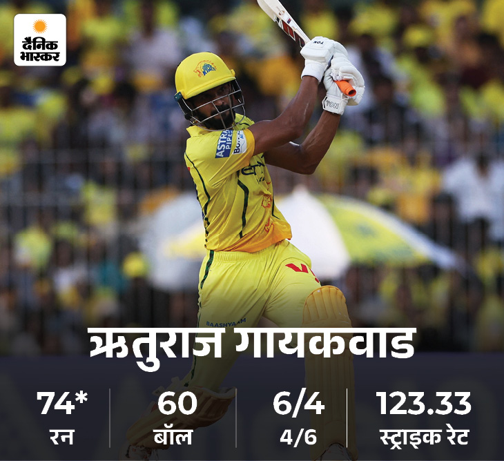 गायकवाड 60 गेंदों में 74 रन बनाकर नाबाद रहे और टीम को सम्मानजनक स्कोर तक पहुंचाया। चेन्नई ने आखिरी 8 ओवर में 107 रन जोड़कर शानदार वापसी की।