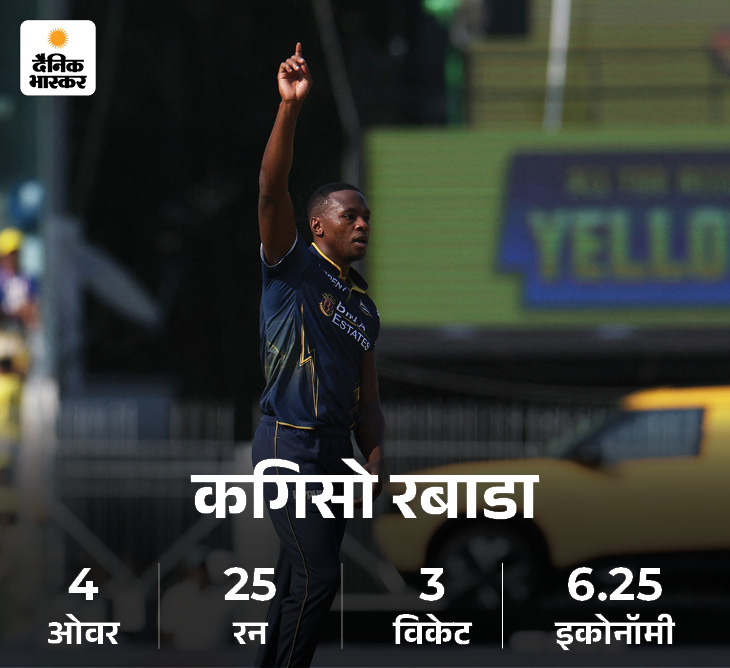 गुजरात के लिए कगिसो रबाडा ने 3 विकेट लिए। उन्हें प्लेयर ऑफ द मैच चुना गया। मोहम्मद सिराज, मानव सुथार और अरशद खान को 1-1 विकेट मिला।