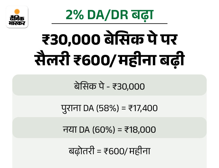 सरकार ने केंद्रीय कर्मचारियों के महंगाई भत्ते (DA) और महंगाई राहत (DR) में 2% की बढ़ोतरी को मंजूरी दे दी है। सरकार ने DA-DR 58% से बढ़कर 60% किया है। यह बढ़ोतरी 1 जनवरी 2026 से लागू होगी। इस फैसले से सरकार का सालाना 6,791 करोड़ रुपए का खर्च बढ़ेगा।