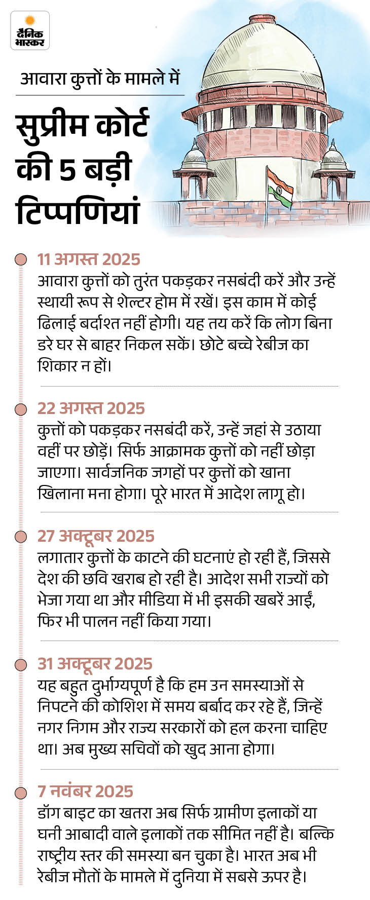 - 7 नवंबर 2025: कोर्ट ने शैक्षणिक संस्थान, अस्पताल, रेलवे स्टेशनों आदि से आवारा कुत्तों को हटाने का निर्देश जारी किया। आदेश में कहा गया कि ठिकानों से हटाए गए कुत्ते फिर वहीं वापस नहीं छोड़े जाएं। पढ़ें पूरी खबर…
