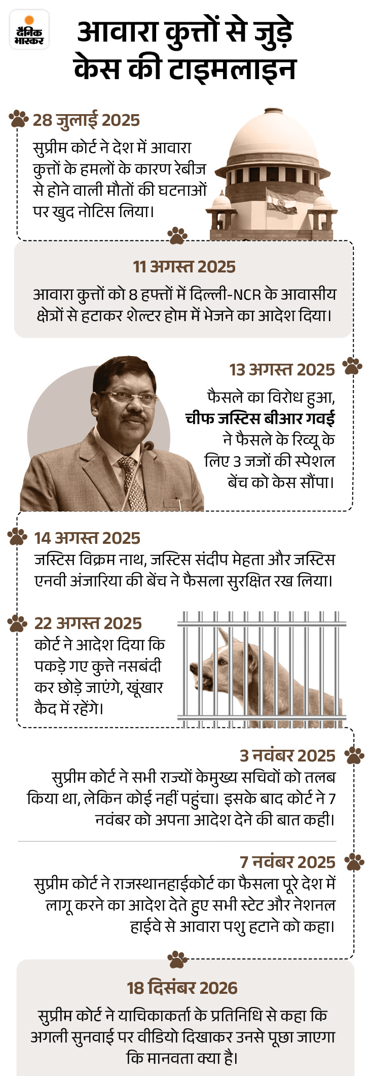 यह मामला 28 जुलाई 2025 को सुप्रीम कोर्ट के एक्शन से शुरू हुआ था, जब दिल्ली में आवारा कुत्तों के काटने से होने वाली रैबीज बीमारी पर एक मीडिया रिपोर्ट पब्लिश की गई थी। इस मामले में अब तक 5 बार सुनवाई हो चुकी है।