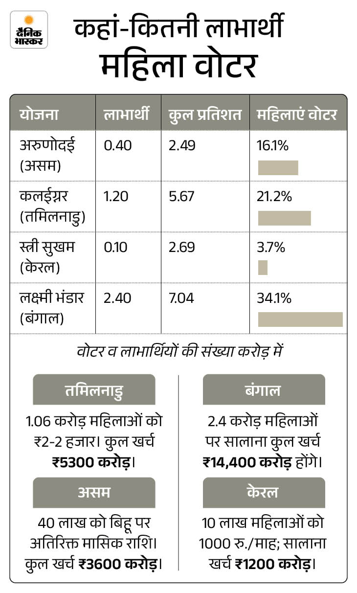 चारों राज्यों में सभी योजना की लाभार्थी महिलाओं की संख्या 4.1 करोड़ है, जबकि कुल वोटर 17.89 करोड़। यानी इनमें नकद स्कीमों की कुल लाभार्थी 23% हैं।