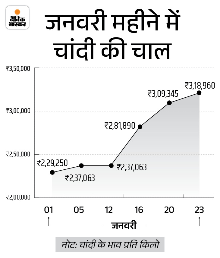 वहीं, 1 किलो चांदी 19,249 रुपए बढ़कर 3,18,960 रुपए पर पहुंच गई है। इससे पहले गुरुवार को ये 2,99,711 रुपए पर थी। इस साल सिर्फ 23 दिनों में सोना 22,233 रुपए और चांदी 88,540 रुपए महंगी हो चुकी है।