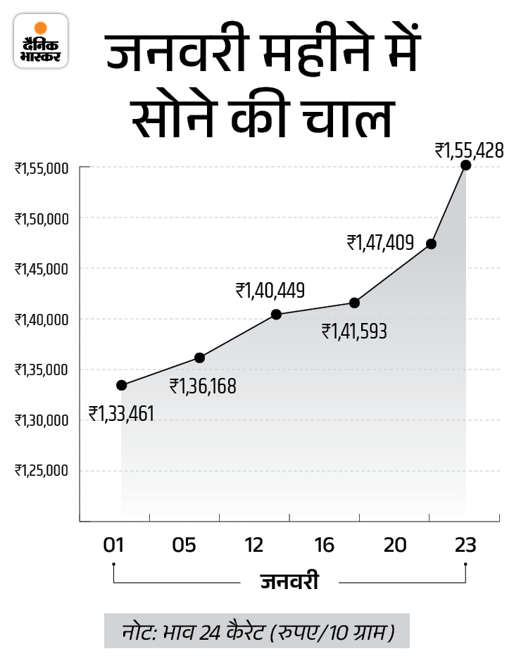 सोने के दाम आज यानी 23 जनवरी को ऑल टाइम हाई पर पहुंच गए हैं। इंडिया बुलियन एंड ज्वेलर्स एसोसिएशन (IBJA) के अनुसार सोना 4,300 रुपए बढ़कर 1,55,428 रुपए प्रति 10 ग्राम पर पहुंच गया है।इससे पहले ये 1,51,128 रुपए पर था।