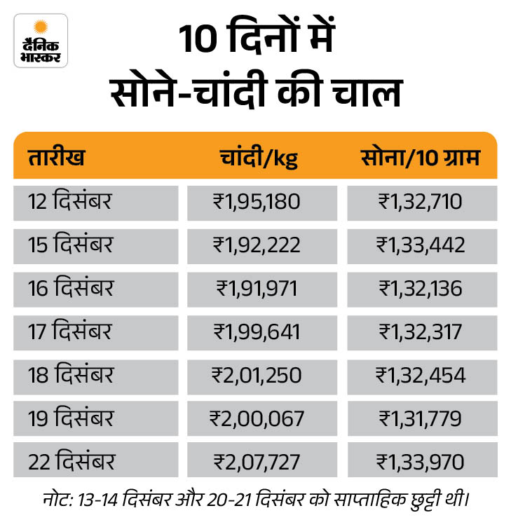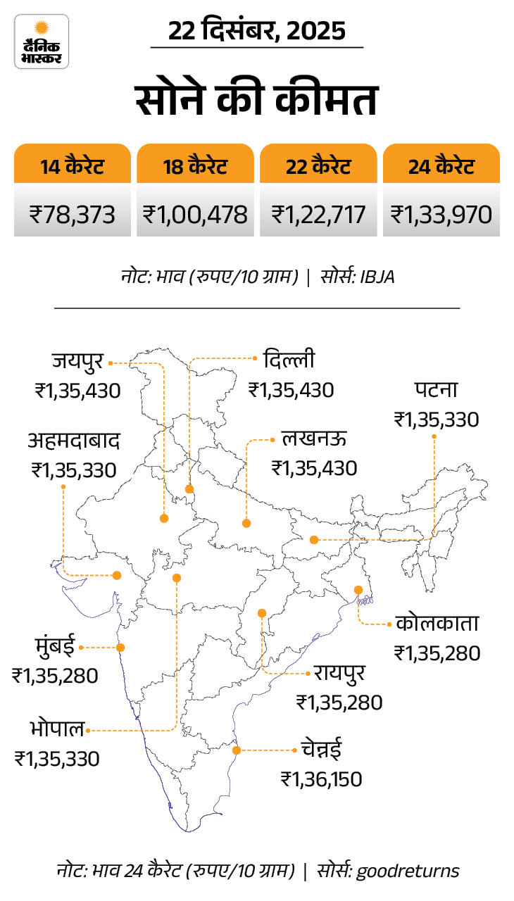 Gold Price Today (22 December 2025); Sona Chandi Ka Bhav Aaj Ka Kya Hai | Business News | सोना-चांदी ऑल टाइम हाई पर: सोना ₹2,191 बढ़कर ₹1.34 लाख का 10 ग्राम हुआ, चांदी ₹7,660 महंगी होकर ₹2.08 लाख किलो पर पहुंची