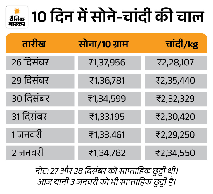 Gold Price Today (3 January 2026); Sona Chandi Ka Bhav Aaj Ka Kya Hai | Business News | इस हफ्ते चांदी महंगी हुई, सोने के दाम कम हुए: सोना ₹3174 गिरकर ₹1.35 लाख पर आया, चांदी ₹6443 बढ़कर ₹2.35 लाख किलो हुई