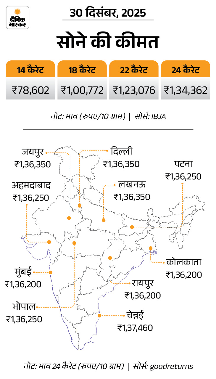 - बीते एक साल में सोने की कीमत 56,937 रुपए (75%) बढ़ी है। 31 दिसंबर 2024 को 10 ग्राम 24 कैरेट सोना 76,162 रुपए का था, जो अब 1,33,099 रुपए हो गया है।