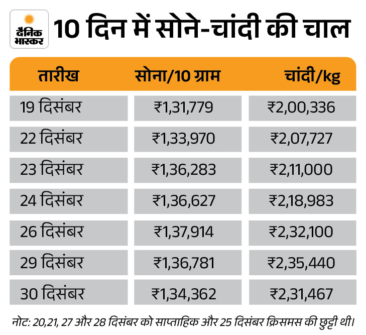 इससे पहले 29 दिसंबर को कारोबार के दौरान सोने की कीमत 1,38,161 रुपए प्रति 10 ग्राम और चांदी की 2,43,483 रुपए प्रति किलोग्राम तक पहुंच गई थी। ये दोनों का अब तक का सबसे ज्यादा भाव यानी ऑल टाइम हाई रेट है।