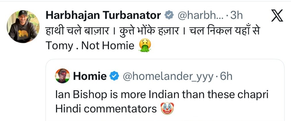 विवाद तब और बढ़ गया जब एक यूजर ने कमेंट्री पैनल की फोटो शेयर कर उन्हें 3 जोकर कह दिया। कई दर्शकों ने तुलना करते हुए कहा कि इंग्लिश कमेंट्री में इयान बिशप जैसे एक्सपर्ट खेल की गहराई समझाते हैं, जबकि हिंदी पैनल केवल मनोरंजन तक सीमित रह गया है। इस पर भज्जी ने ट्रोलर्स को जवाब दिया। उन्होंने एक कमेंट में लिखा- हाथी चले बाजार, कुत्ते भौंके हजार।
