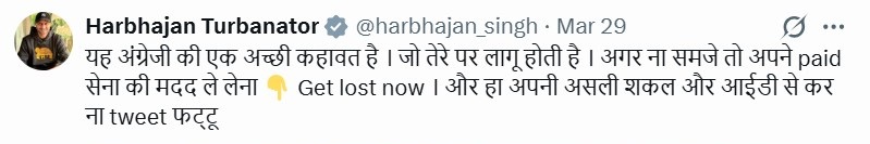 - धोनी ने लात मार के निकला था तेरे को टीम से: एक्स पर यूजर ने हरभजन की कमेंट्री और उनके पास्ट को निशाना बनाते हुए तीखे शब्दों का इस्तेमाल किया। @होमलेंडर-वाई-वाई-वाई अकाउंट से लिखा गया कि घी मत खा भाई और क्यों भौंक रहा है, इसी की वजह से धोनी ने लात मार के निकाला था तेरे को टीम से।