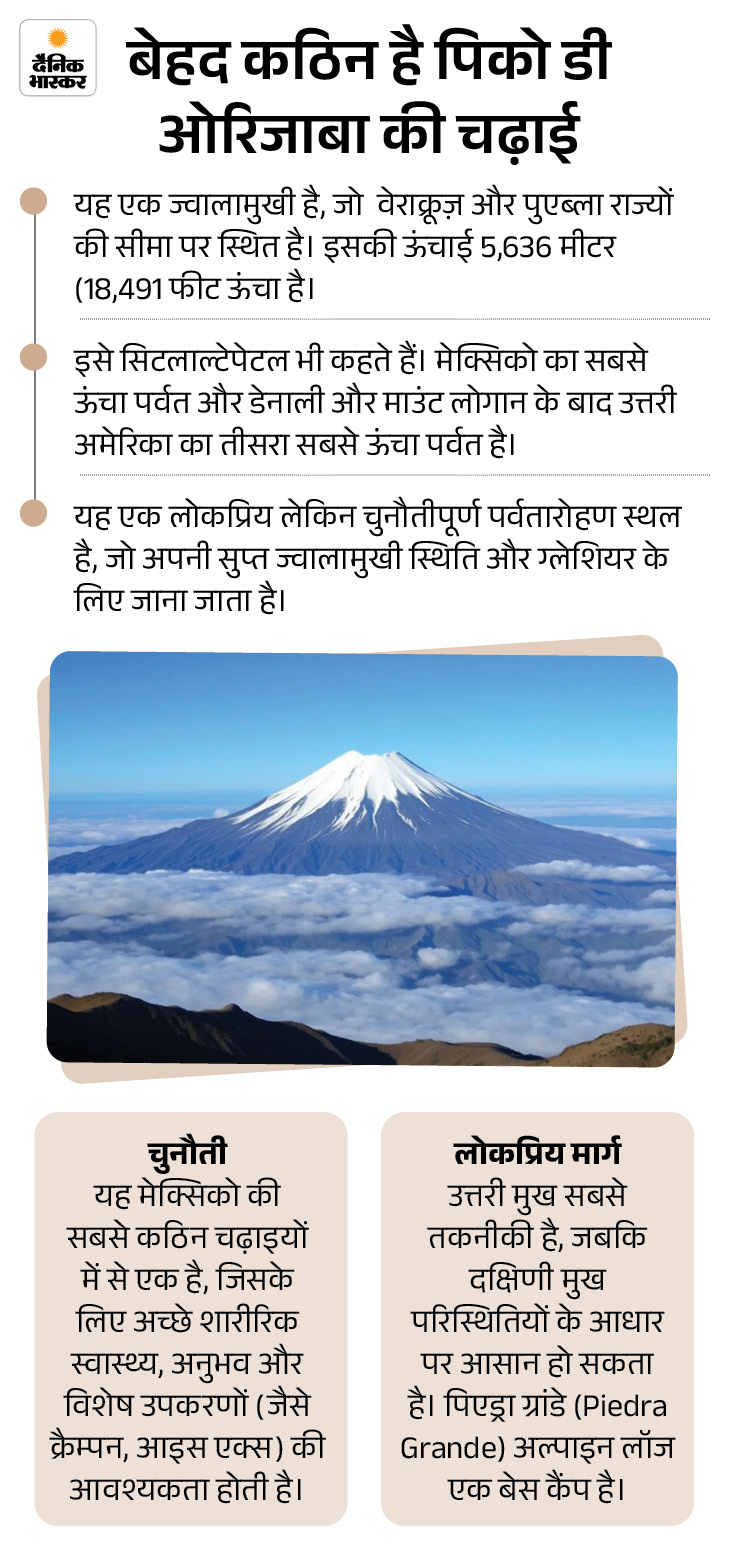 ऊंचाई पर ऑक्सीजन की कमी और बर्फीला तूफान बड़ी चुनौती नरेंद्र कुमार के मुताबिक, 5,636 मीटर यानी 18,491 फीट की ऊंचाई पर स्थित पिको डी ओरिजाबा पर्वतारोहियों के लिए किसी अग्निपरीक्षा से कम नहीं है। यहां की ठंडी तेज हवा, बर्फ से ढकी सतह और अचानक बदलने वाला मौसम हर कदम पर चुनौती खड़ी करता है।