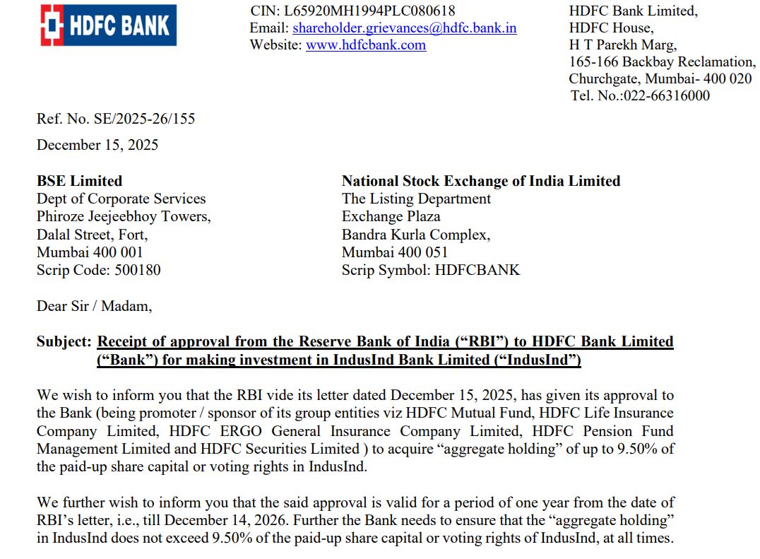 यह मंजूरी एक साल तक वैलिड रहेगी, यानी 14 दिसंबर 2026 तक। HDFC बैंक और इंडसइंड बैंक दोनों ने एक्सचेंज फाइलिंग में इसकी जानकारी दी है।