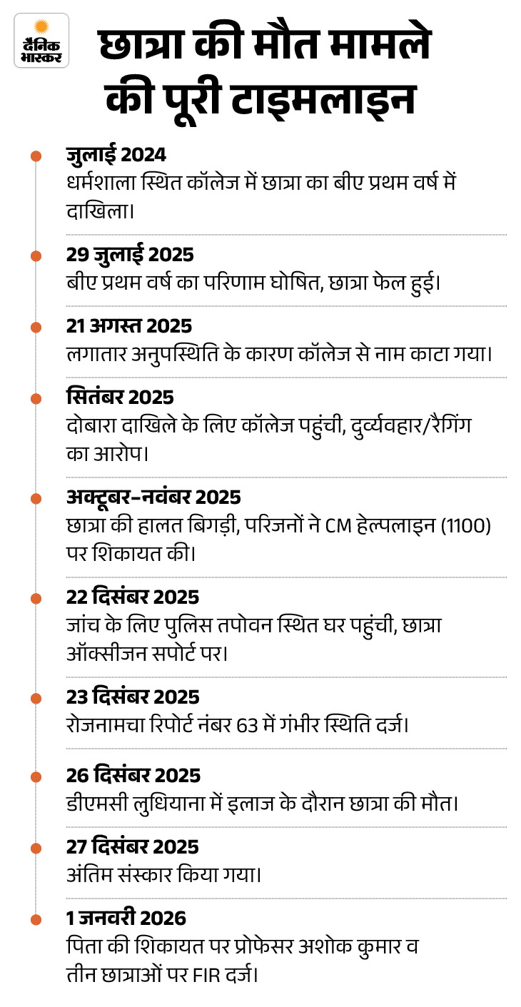 • परिजनों ने CM हेल्पलाइन पर शिकायत कीः छात्रा की हालत बिगड़ने पर परिजनों ने CM हेल्पलाइन (1100) पर रैगिंग और प्रोफेसर के खिलाफ शिकायत की। इसके बाद जांच के लिए पुलिस तपोवन स्थित उसके घर पहुंची, जहां छात्रा ऑक्सीजन सपोर्ट पर मिली।