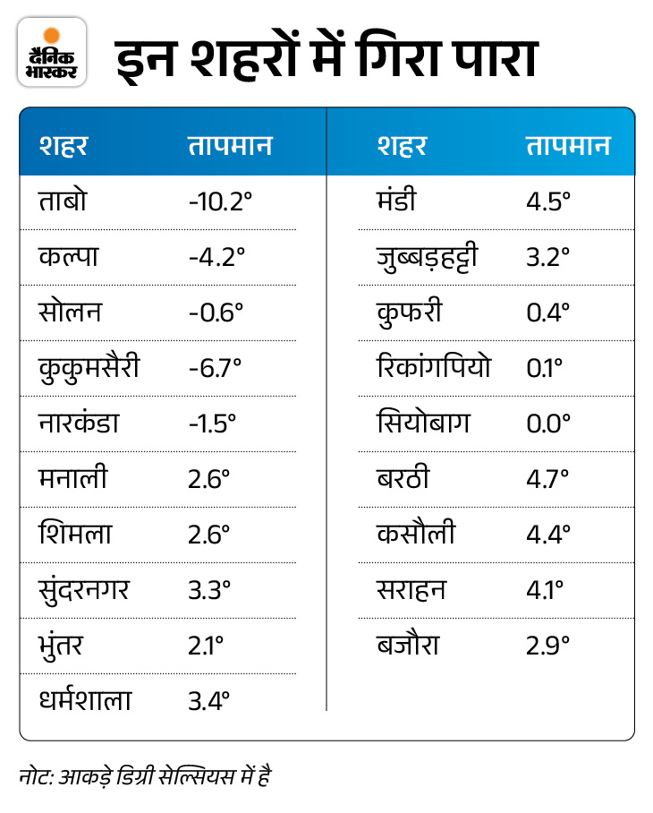 लाहौल-स्पीति के ताबो में न्यूनतम तापमान माइनस -10.2 डिग्री सेल्सियस रिकॉर्ड किया गया, जो प्रदेश में सबसे कम रहा। किन्नौर के कल्पा में माइनस -4.2, कुकुमसैरी में माइनस -6.7, नारकंडा में माइनस -1.5 और सोलन में माइनस -0.6 डिग्री तापमान दर्ज हुआ है।