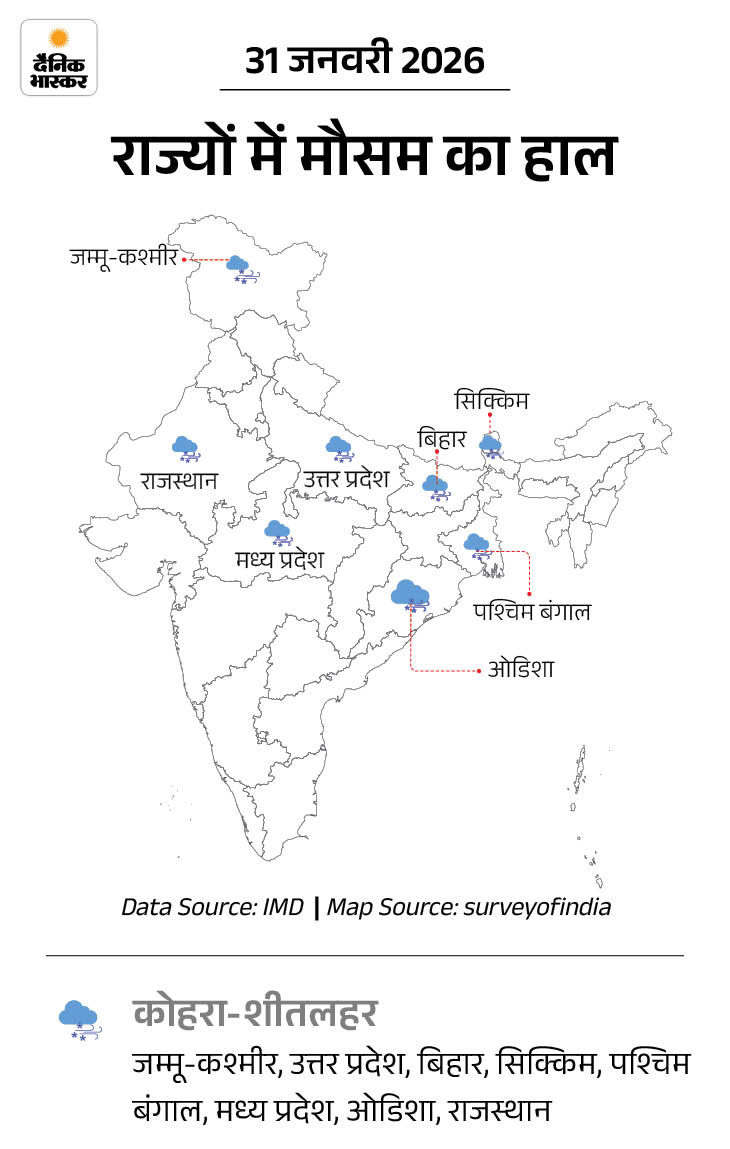 1 फरवरी: दिल्ली-एनसीआर में बादल छाए रहेंगे। मध्य प्रदेश, पंजाब, हरियाणा, उत्तर प्रदेश, राजस्थान, गुजरात में बारिश की संभावना है। हिमाचल, उत्तराखंड में बर्फबारी हो सकती है। बिहार, झारखंड में कोहरा रह सकता है।