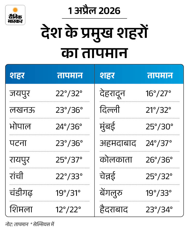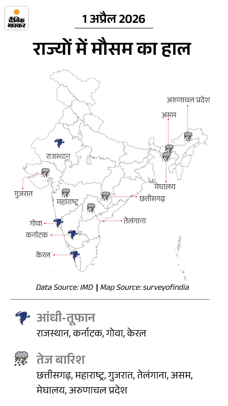 • 2 अप्रैल- पश्चिम बंगाल, सिक्किम, गुजरात, झारखंड और बिहार में हल्की बारिश की संभावना है। कर्नाटक में बिजली गिरने की आशंका है।
