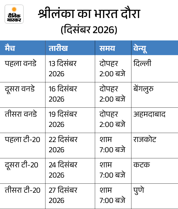 श्रीलंका टीम दिसंबर में आएगी इसके बाद दिसंबर 2026 में श्रीलंका टीम भारत दौरे पर आएगी, जहां दोनों टीमों के बीच तीन वनडे और तीन टी-20 मैचों की सीरीज खेली जाएगी।