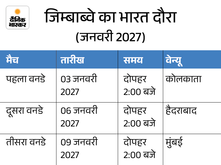 जनवरी-फरवरी में भारत-ऑस्ट्रेलिया 5 टेस्ट खेलेंगे नए साल की शुरुआत में जनवरी 2027 में जिम्बाब्वे टीम भारत दौरे पर तीन वनडे मैच खेलेगी। ये मुकाबले कोलकाता, हैदराबाद और मुंबई में आयोजित होंगे।