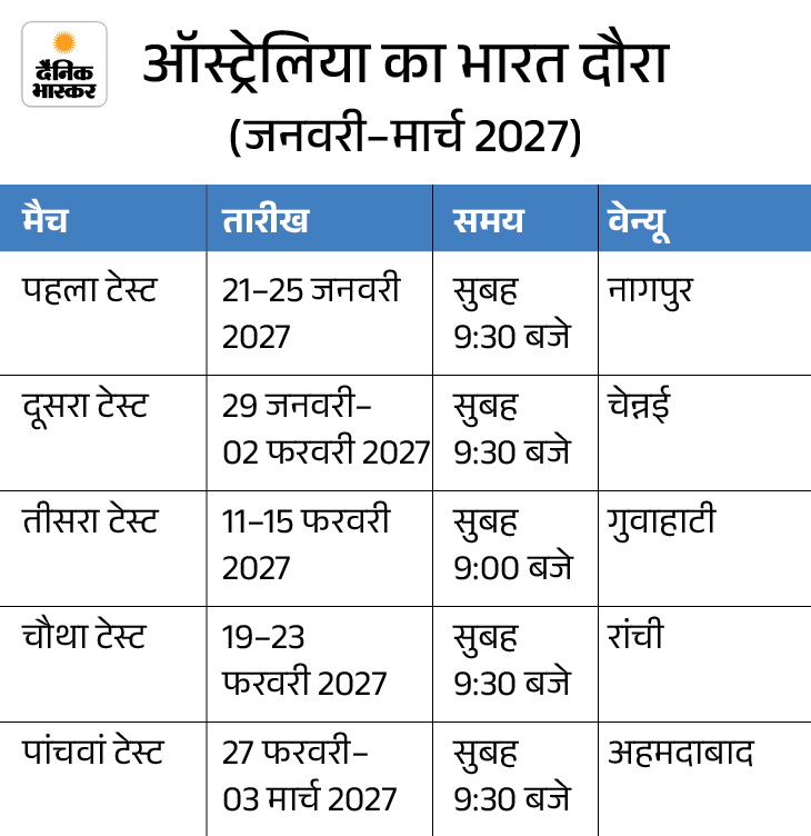 इसके बाद भारत और ऑस्ट्रेलिया के बीच पांच टेस्ट मैचों की सीरीज 21 जनवरी 2027 से नागपुर में शुरू होगी। बाकी टेस्ट चेन्नई, गुवाहाटी, रांची और अहमदाबाद में खेले जाएंगे।
