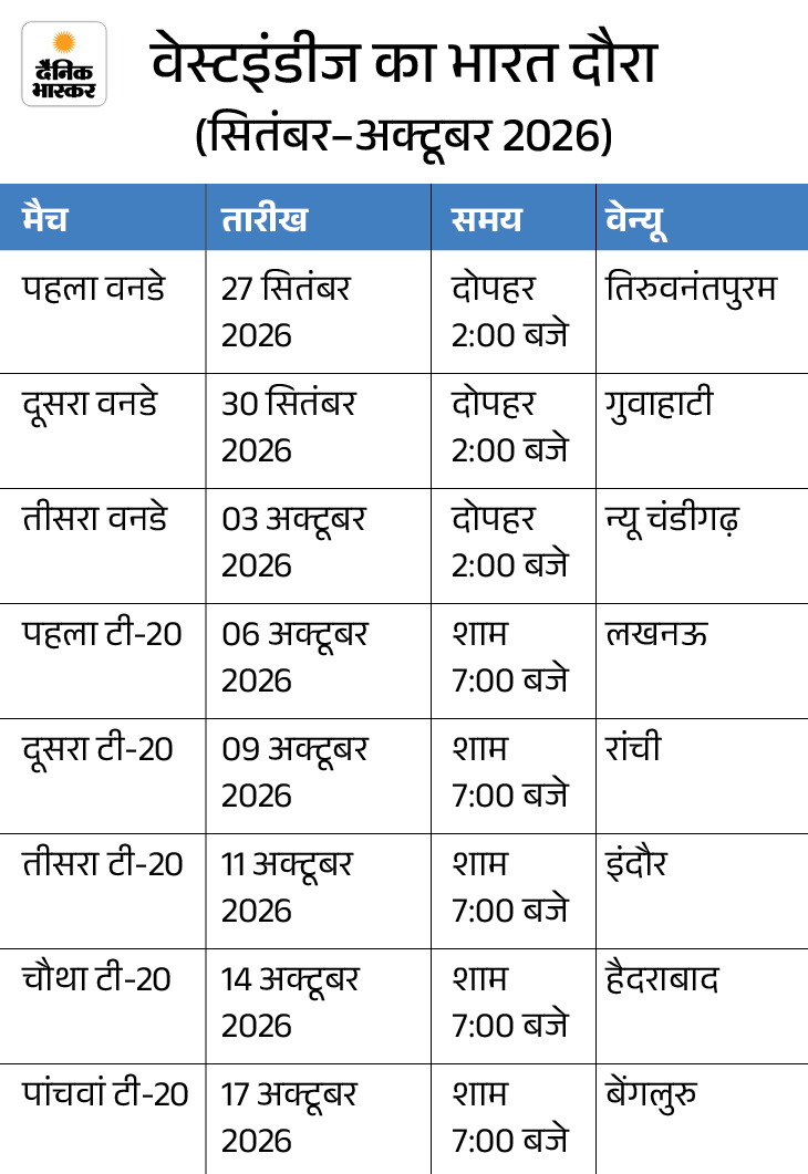 वेस्टइंडीज दौरे से शुरू होगा सीजन सीजन की शुरुआत 27 सितंबर 2026 से वेस्टइंडीज के भारत दौरे के साथ होगी। इस दौरे में तीन वनडे और पांच टी-20 मैच खेले जाएंगे। वनडे मुकाबले तिरुवनंतपुरम, गुवाहाटी और न्यू चंडीगढ़ में होंगे, जबकि टी-20 सीरीज लखनऊ, रांची, इंदौर, हैदराबाद और बेंगलुरु में खेली जाएगी।