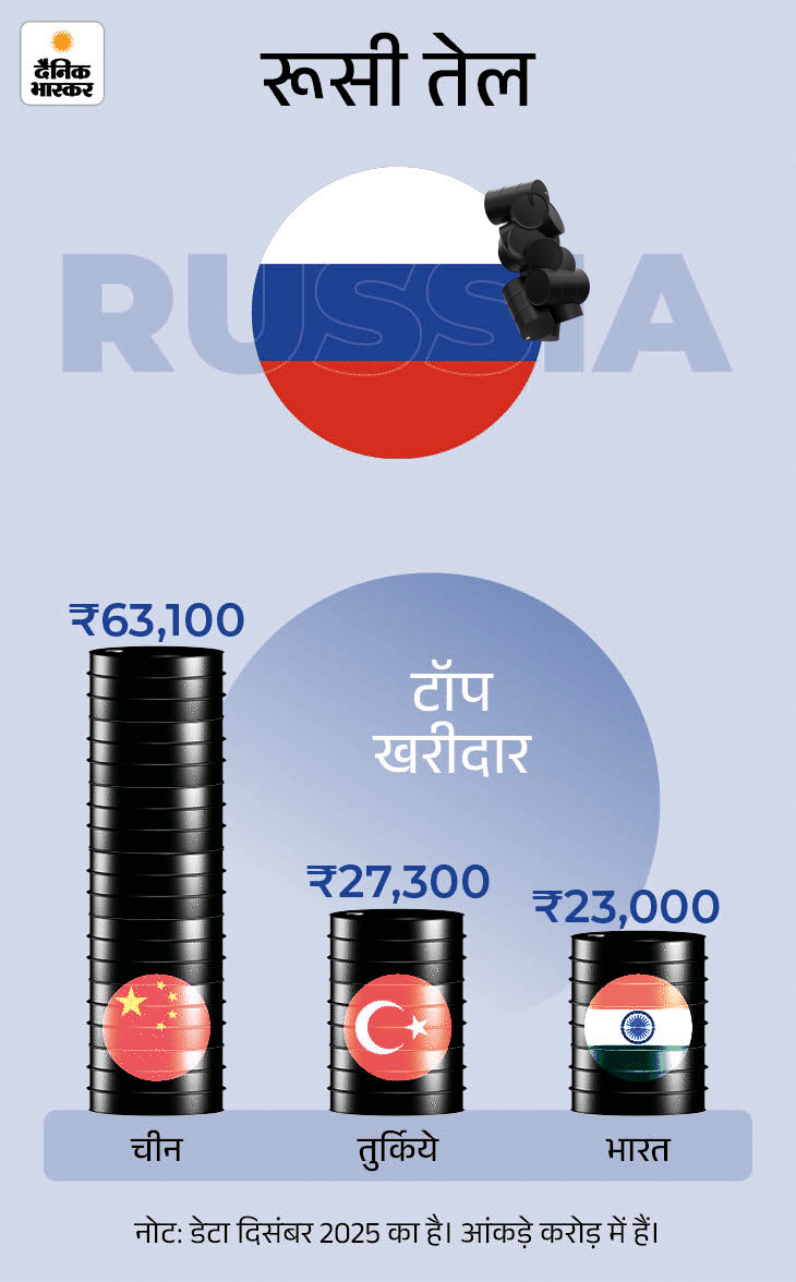 Indias Russia Oil Imports Drop 29% in Dec; Turkiye Becomes 2nd Largest Buyer | रूसी तेल खरीदने में भारत तीसरे नंबर पर खिसका: दिसंबर में रिलायंस और सरकारी कंपनियों ने 29% कम खरीदा; तुर्किये बना दूसरा बड़ा ग्राहक