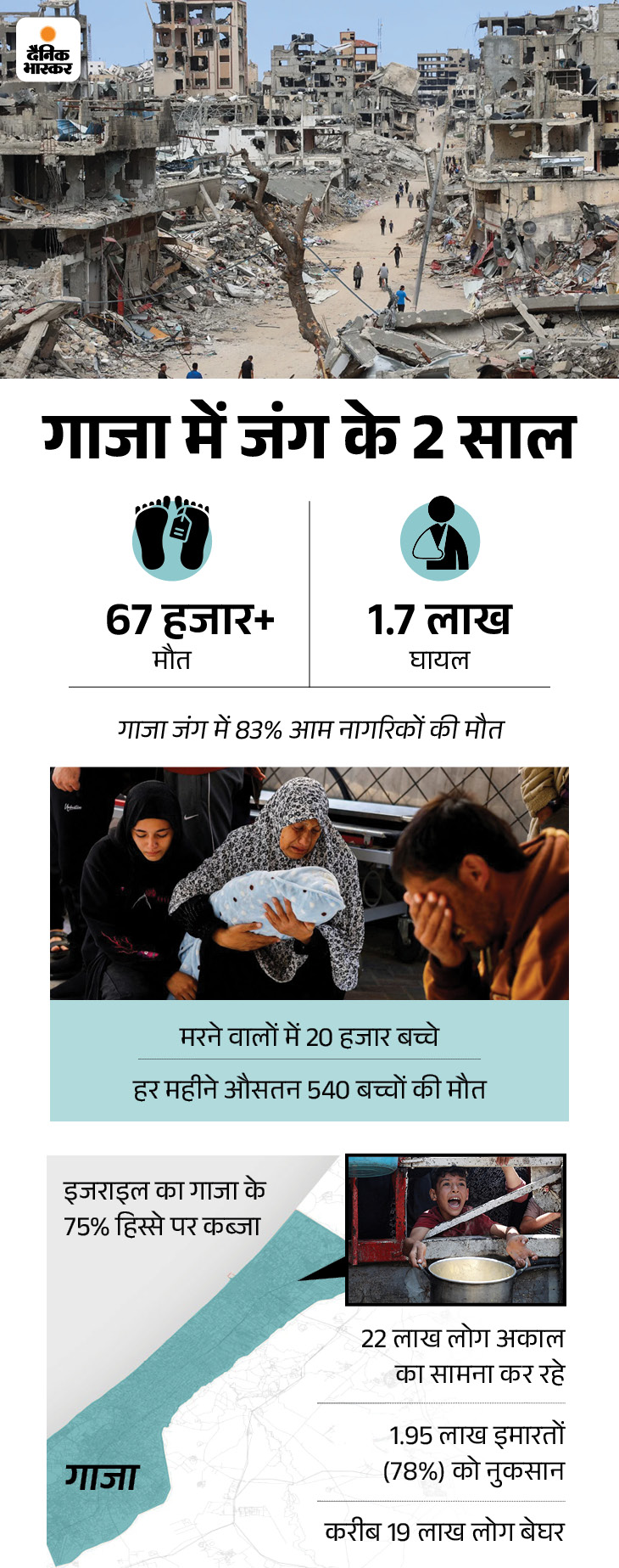 वहीं, 17,000 फिलिस्तीनी बच्चे माता-पिता दोनों खो चुके हैं। राहत एजेंसियां कहती हैं- यह अब शहर नहीं, जिंदा बचे लोगों का कैंप मात्र है।