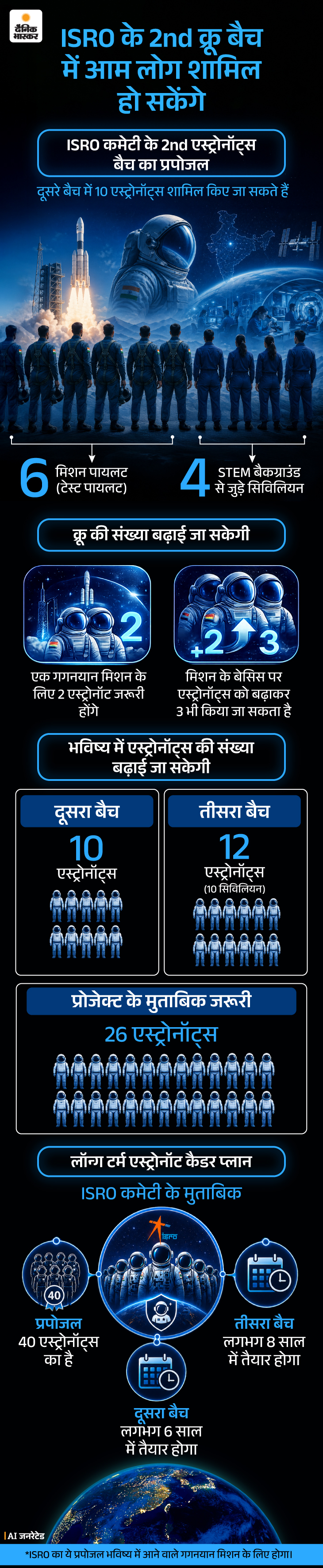 कमेटी की सिफारिश में कहा गया है कि गगनयान मिशन के अंतरिक्ष यात्रियों के दूसरे बैच में वायुसेना के 6 पायलट के साथ 4 सिविलियन स्पेशलिस्ट शामिल किए जाएं। ये सिविलियन साइंस, टेक्नोलॉजी, इंजीनियरिंग और मैथ (STEM) बैकग्राउंड से होंगे।