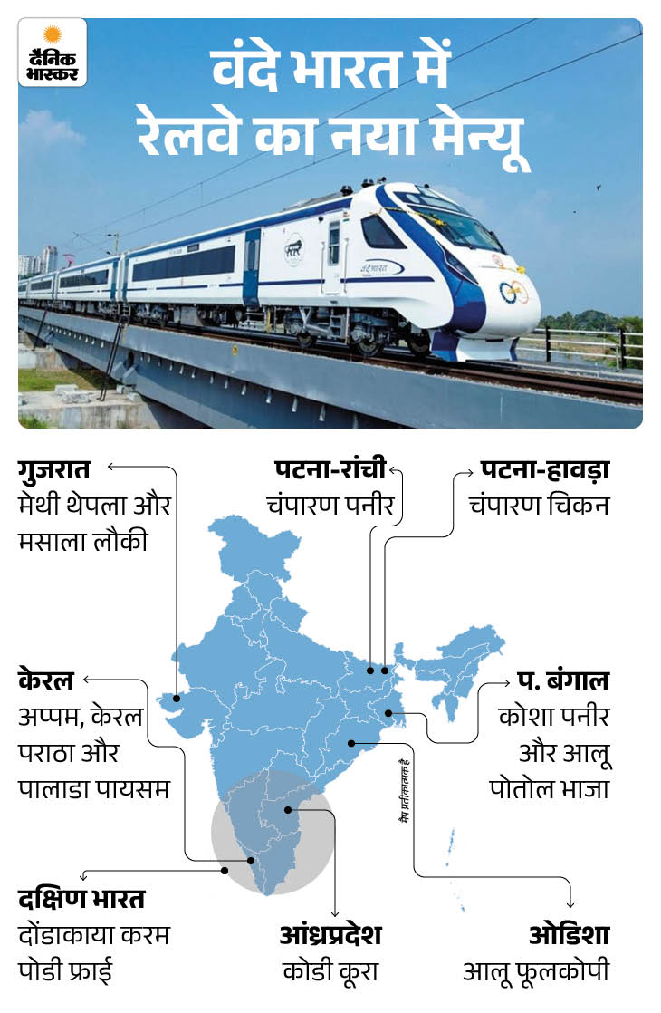 नई लिस्ट के मुताबिक, पटना-रांची वंदे भारत में ‘चंपारण पनीर’ और पटना-हावड़ा रूट पर ‘चंपारण चिकन’ मिलेगा। गुजरात के रूट पर चलने वाली ट्रेनों में यात्रियों को मेथी थेपला और मसाला लौकी परोसी जा रही है।
