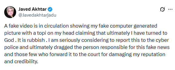 आगे जावेद अख्तर ने लिखा है, ‘मैं इस मामले को लेकर बेहद गंभीर हूं और इस फर्जी खबर की शिकायत साइबर पुलिस में दर्ज कराने पर गंभीरता से विचार कर रहा हूं। साथ ही, जो भी व्यक्ति इस झूठे वीडियो को बनाने और फैलाने के लिए जिम्मेदार है, और वे लोग जिन्होंने इसे आगे बढ़ाया है, उनके खिलाफ मेरी छवि, प्रतिष्ठा और विश्वसनीयता को नुकसान पहुंचाने के लिए कानूनी कार्रवाई कर उन्हें अदालत तक ले जाने का इरादा है।’