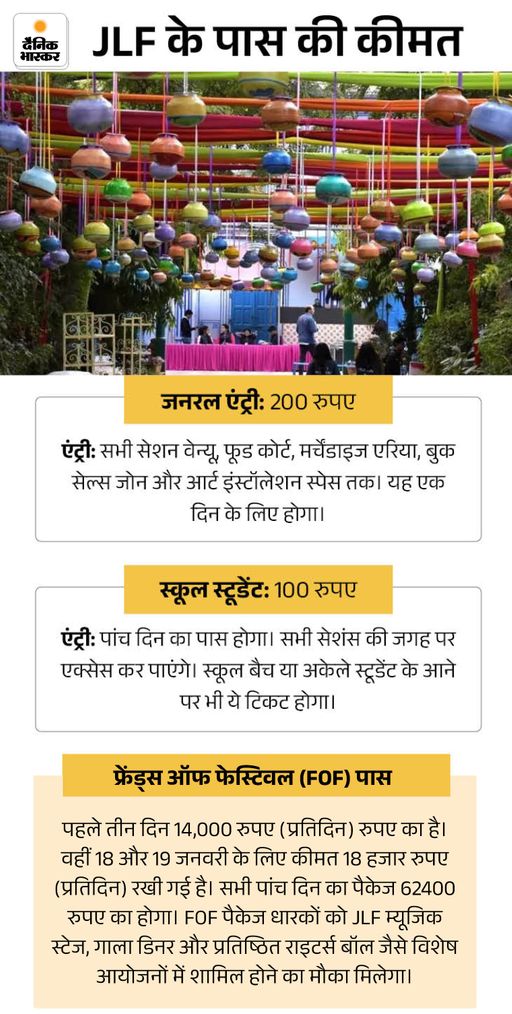 फेस्टिवल में आज ‘बापजी, महाराजा ऑफ मारवाड़- जोधपुर: द किंग हू वुड बी मैन’ सेशन में जोधपुर के पूर्व राजपरिवार के गज सिंह, लेखक अमन नाथ और योगी वैद्य से रीमा हूजा बातचीत करेंगी। ‘द सेंसुअल सेल्फ : ग्लैमर, सेलिब्रिटी एंड सब्सटेंस’ सेशन में शोभा डे के साथ अनीश गवांडे चर्चा करेंगे।