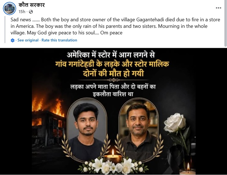 हरियाणा के युवक की अमेरिका के टेक्सास शहर में फूड स्टोर में लगी आग में जिंदा जलकर मौत हो गई। इस घटना में पंजाब के रहने वाले स्टोर मालिक की भी मौत हो गई। जिस वक्त आग लगी, उस समय युवक और उसका मालिक स्टोर के अंदर ही सो रहे थे।