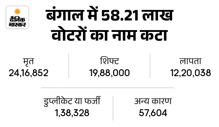 पश्चिम बंगाल में स्पेशल इंटेंसिव रिवीजन (SIR) के बाद 16 दिसंबर को बंगाल की ड्राफ्ट वोटर लिस्ट पब्लिश हुई थी, जिसमें 58.21 लाख लोगों के नाम काटे गए थे। इसके बाद दावा, आपत्ति और सुनवाई की प्रक्रिया चल रही है।