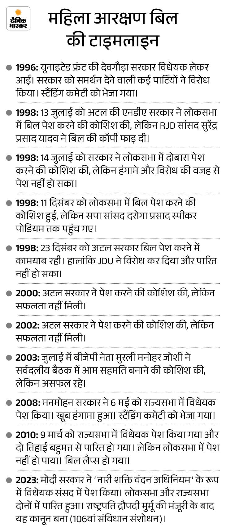 1993: 73वें और 74वें संविधान संशोधनों में पंचायतों और नगर निकायों में महिलाओं के लिए एक-तिहाई सीटें आरक्षित की गईं। महाराष्ट्र, आंध्र प्रदेश, बिहार, छत्तीसगढ़, झारखंड और केरल सहित कई राज्यों ने स्थानीय निकायों में महिलाओं के लिए 50% आरक्षण लागू किया है।