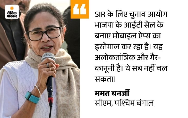 पश्चिम बंगाल की सीएम ममता बनर्जी ने स्पेशल इंटेंसिव रिवीजन (SIR) को लेकर चुनाव आयोग पर गंभीर आरोप लगाए। उन्होंने कहा कि चुनाव आयोग राज्य में चल रही SIR प्रक्रिया में भाजपा की आईटी सेल के बनाए मोबाइल ऐप्स का इस्तेमाल कर रहा है।